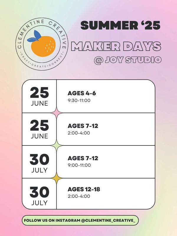 Clementine Creative is a crafting club for kids designed to spark imagination, build confidence, and foster connection through hands-on creative experiences. Their programs offer a safe, joyful space where kids can explore their creativity through guided craft projects, collaborative play, and open-ended art. From maker day workshops to camps, classes and pop-ups around town-Clementine Creative is where kids craft, create, and connect.